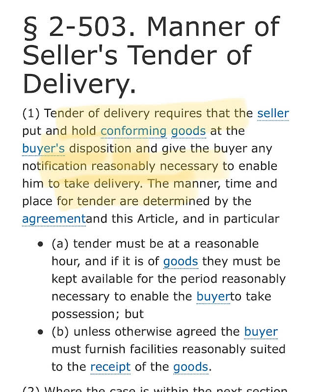 Tender of delivery requires that the seller or lessor hold the goods. The sellers or lessors. Make the goods available to the buyer for pick-up.